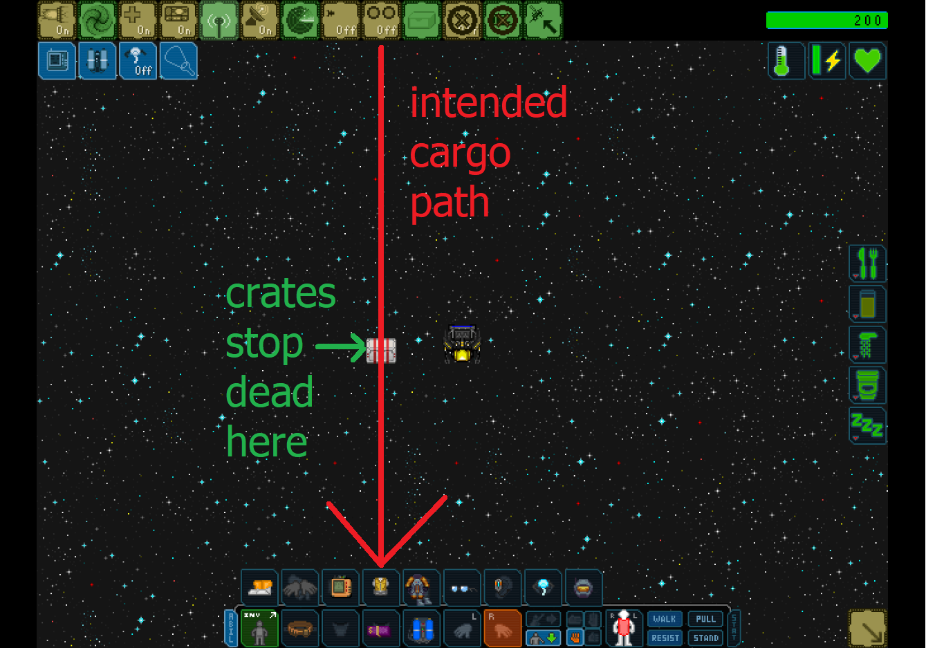 Outgoing cargo is currently broken. Crates fired out the mass driver inexplicably come to a stop part way into space, always in the same spot. Crates can only be delivered by firing a second crate at the first, knocking it forwards billiards style.