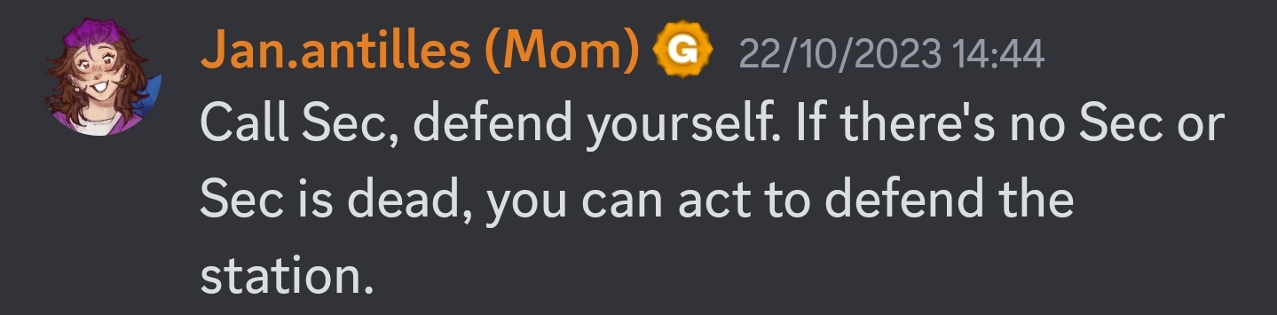 (08-06-2024, 12:16 AM)Carton Wrote: From my understanding, it isn't exactly that security are the only ones allowed to "Deal with antags" as far as fighting them goes, but you should preferably be letting them do it if they're at present on station. You're allowed to defend yourself and others if they aren't there, but you should also be calling security and letting them take over once they arrive.