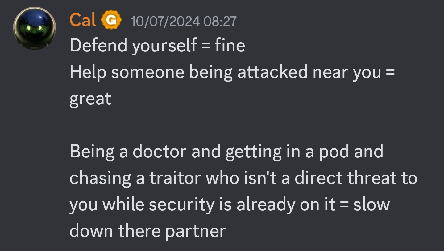 (08-06-2024, 12:16 AM)Carton Wrote: From my understanding, it isn't exactly that security are the only ones allowed to "Deal with antags" as far as fighting them goes, but you should preferably be letting them do it if they're at present on station. You're allowed to defend yourself and others if they aren't there, but you should also be calling security and letting them take over once they arrive.